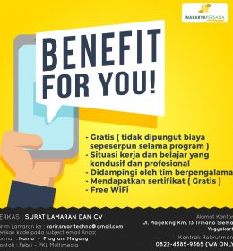 We want you! Siap untuk seru-seruan bareng kami? Yuk gabung dalam program internship Inakarya Persada. Inakarya Persada adalah holding company yang menaungi beberapa unit bisnis, yaitu smart techno center dan aladin karpet. Smart techno center bergerak di bidang manufaktur dan... selengkapnya